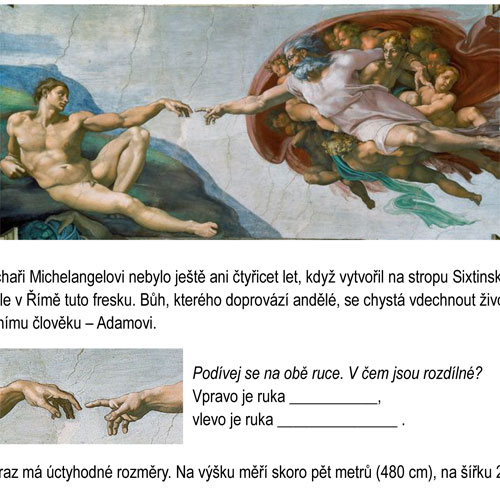 Sada šesti pracovních listů, na nichž se děti seznámí se třemi známými díly italské renesance. Zároveň poznají tři umělce té doby. V pracovních listech budou pracovat s díly, doplňovat informace, chápat a vnímat souvislosti. Vyzkouší si číst zrcadlové písmo, budou hledat shodné a rozdílné zobrazení a také popisovat své pocity. Listy je možné použít na prvním i druhém stupni ZŠ, příp. na nižším stupni gymnázií.
