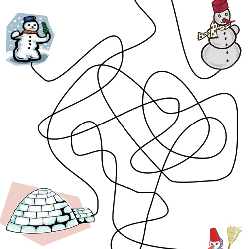 Poznáte, který sněhulák dojde až k iglú? Vyznačte cestu pastelkou.